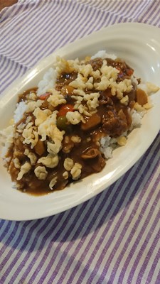 揚げ玉が大量にあったので、カレーにトッピングしてみました。